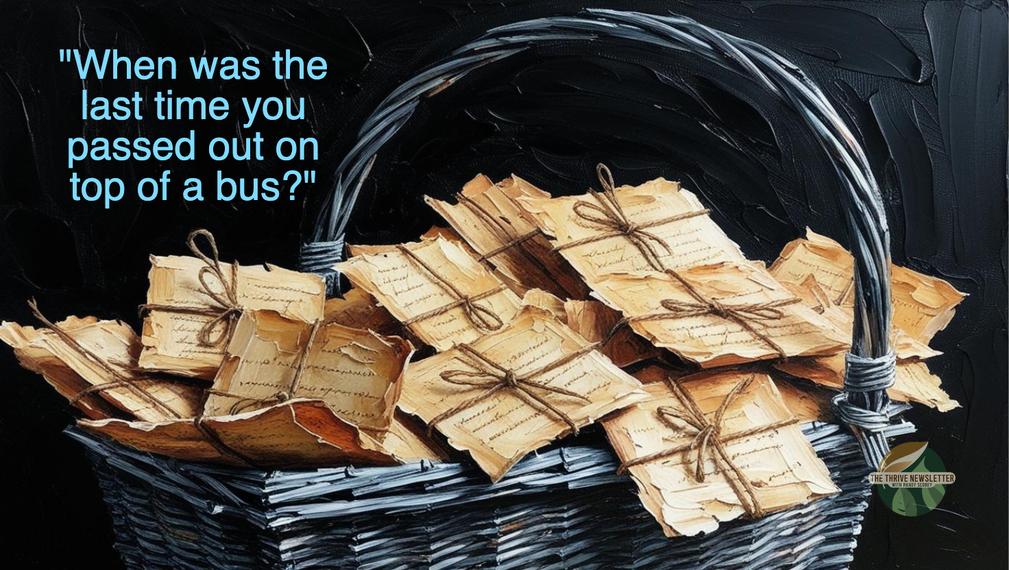 I was amused and said, “Well, I am glad to know that we are kindred spirits, and thanks for the encouragement!” At the same time, I was dying to ask the question of my newly declared kindred spirit, “Soooo… When was the last time you got high and passed out on top of a bus?”